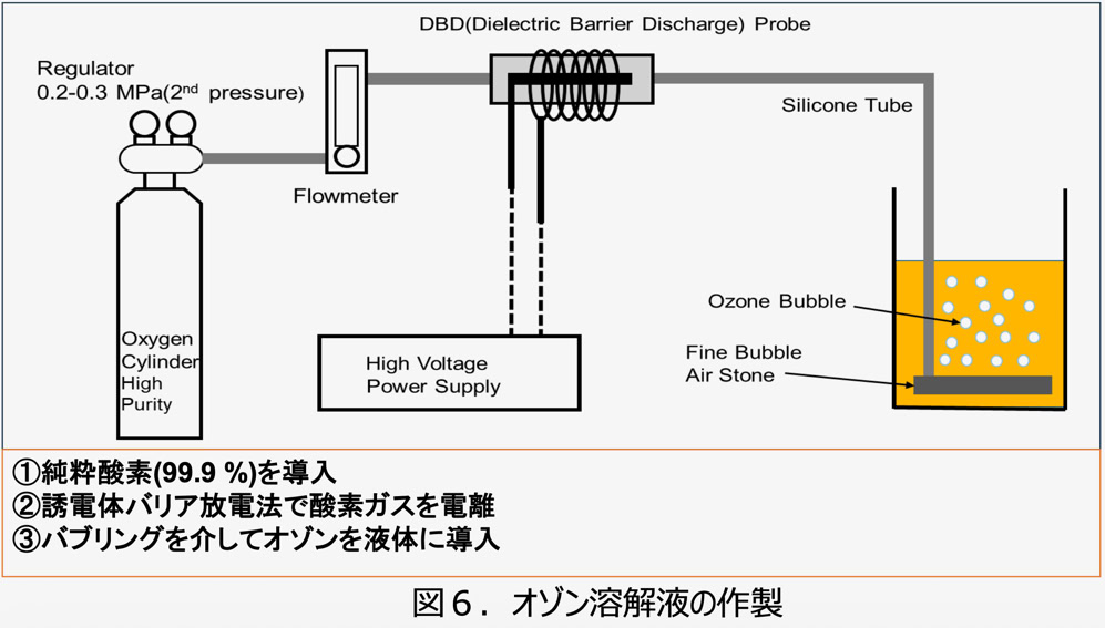 放電によるプラズマで励起してオゾンを作製し、 液体中にバブリングさせるものです。 すべての工程が閉鎖系で行われて空気中の窒素が