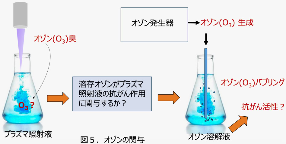 ヒドロキシルラジカルや過酸化水素を生じます。 したがって、 もしかすると空気プラズマ照射液中にはオゾンが存在して抗がん作用に関与する