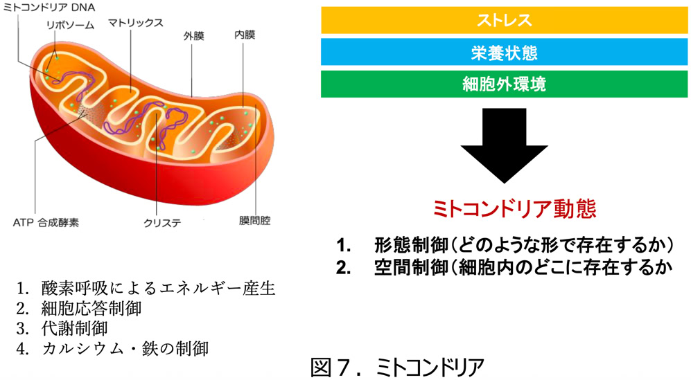 産生の場であるので、 古くは細胞の “ 発電所 ” と呼ばれていました。 しかし現在では、 ミトコンドリアは細胞応答の調節、 代謝、 カルシウム、鉄の制御など非常に多様な機能を持つことがわかっています。 特に注目すべきは、 ミトコンドリアが、 細胞の生と死を司る正反対の機能を