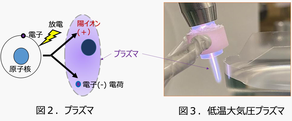 プラズマ (図2) とは部分的に電離 (原子が電子を放出してイオンとなること) したガスで、低温、大気圧条件で生成するものを