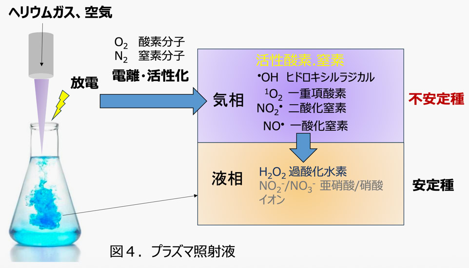 一酸化窒素、 二酸化窒素) が生成されます。 しかし、これらはいずれも寿命が極めて短く、プラズマ照射液中 ( 液相 ) にはこれらの