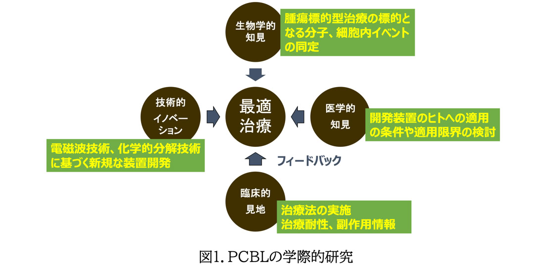 私たちは、医学者、臨床医や工学技術者など様々な分野の専門家と協力して学際的がん治療研究を推進しています(図1)。
